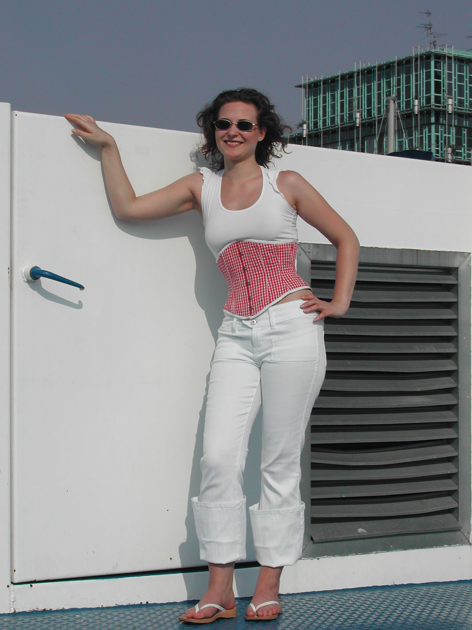 Leinen rot-weiss kariert mit weißer Einfassung und Schnürung