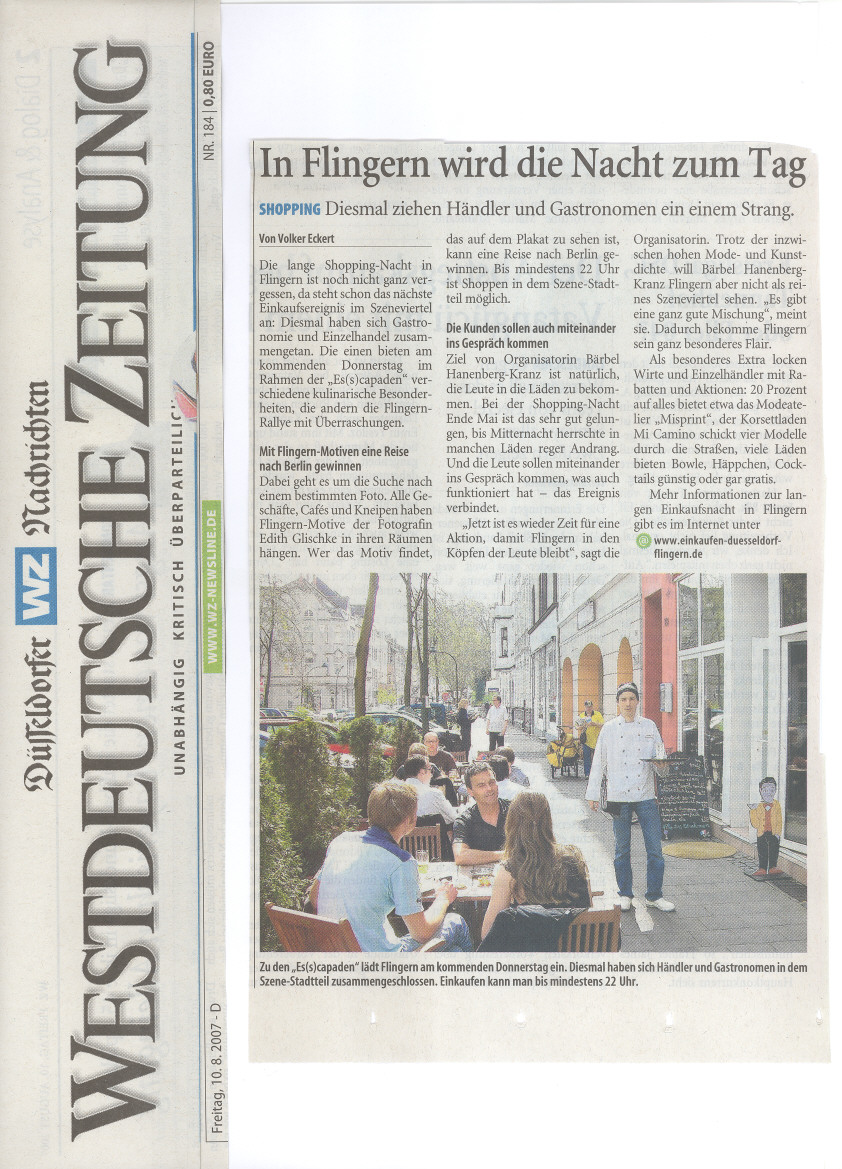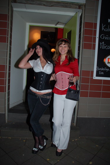 zur Event-Übersicht Es wurde in der smarten Bar waschbütt noch am Vormittag fleißig gewerkelt, denn schließlich sollte die erste Vernissage in diesen Räumlichkeiten gelingen. Als um 20h die Fotomodelle (Bara, Michiko, Steffi, Tatie, Tanja und Patricia -einherzliches Dankeschön an Euch!) in ihren "Kalender-Korsetts" die waschbütt betraten war alles perfekt: die Bilder hingen, das Faß war angezapft und es wurde schon viel gelacht! Kunden, neue Korsettinteressierte und auch neugierige Stammgäste der waschbütt genossen den Abend bei ein, zwei oder mehr Gläsern Uerige vom Faß oder was das Herz sonst so begehrte: Frank und André von der waschbütt waren ein super Team! Selbst eine Anreise aus Siegburg oder Haltern-Lavesum war nicht zu weit. Es wurde viel nachgeschnürt, Knotentechniken ausgetauscht und selbst Frank von der waschbütt wollte seine Wette einlösen und hat sich ein Korsett anziehen lassen ;-) Nicht nur die Signierung der Kalender durch die Models war an diesem Abend angesagt, sondern auch das Signieren der Dekolletés der Modelle vom Fotografen Christian Ritter! ...hier nun ein paar Bilder (nach erfolgter Zensur ;-) sowie Presseberichte aus dem Viertel unter www.einkaufen-duesseldorf-flingern.de :